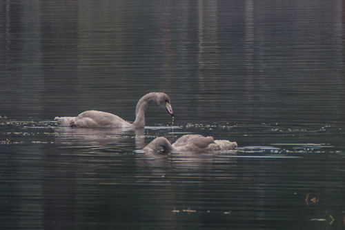I allt regnmurr skymtar sångsvanfamilj. Dom liksom andra är upptagna med att få i sej all mat för tillväxten.