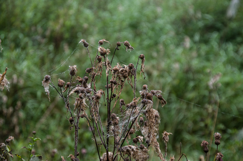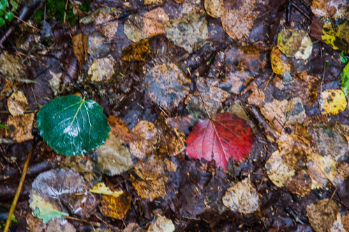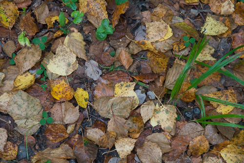 The autumn mosaïc is laid, however not as dramatic as during frost. And one surely finds remarkable things, like the leaf hanging from a thin thread (as if regretting its fall?) or the imaginary one carrying something on its back. And who are those on the stalks?