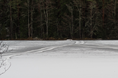 …eller så går det fort. Vidunderliga ismönster växer fram på sjön. Ibland bryts de av regndropparna som piskar vattenytan innan kylan återigen tar sitt grepp. Den översvämmade skogen fryser till.