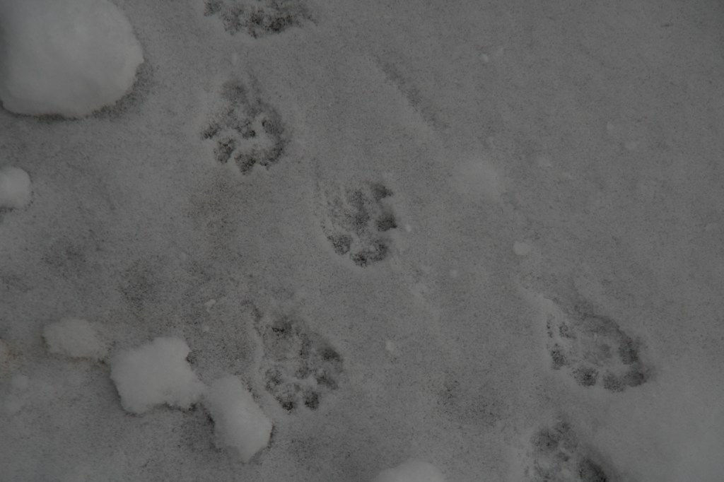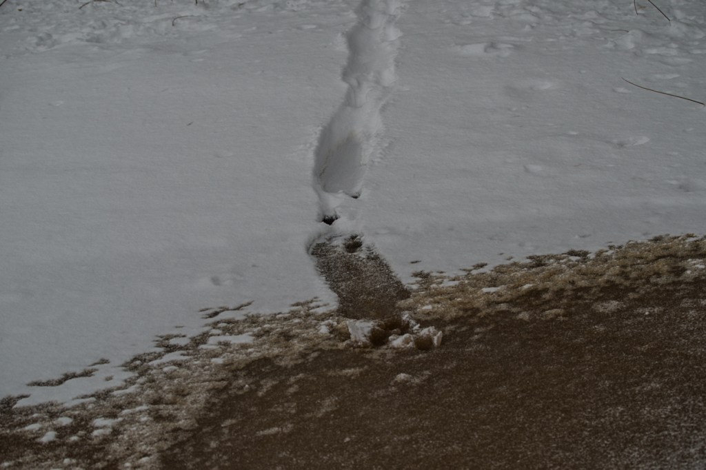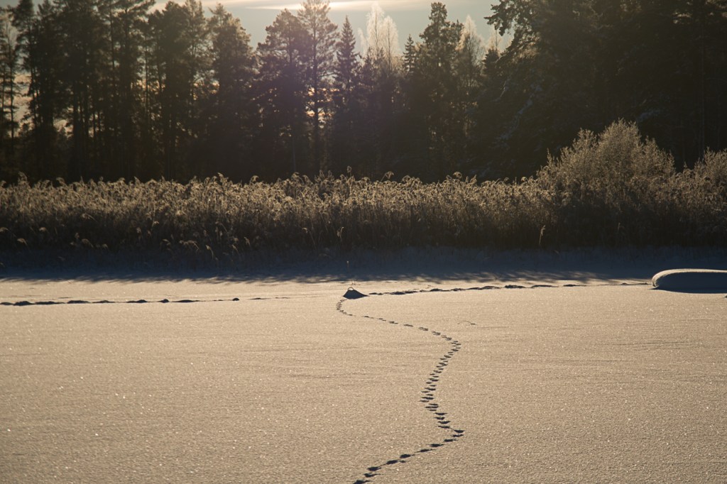 Även i det grå skymtar spår av aktiviteter. Uttern har kanat fram, mården har varit på tur, den imaginära snösvanen tittar fram och rådjuret kommer på besök.