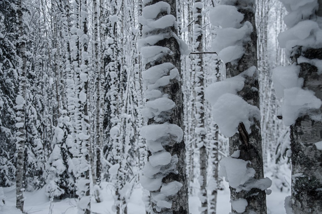 Solens försök att bryta gråheten är ibland fåfäng. Landskapet behåller sin gråhet och granarna vacklar när snömängden blir för stor.