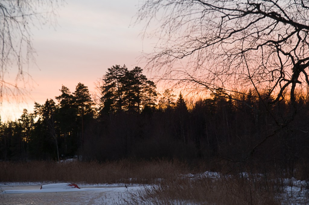 Jag skulle bli jätteglad om du tar en vinterbild, om du är ute och traskar på sjön, när solen lyser upp röda stigan i vinterskrud. Snön har väl ännu inte rasat ner från träden? Då ska jag rama in den och sätta den på väggen framför skrivbordet här i Spanien.