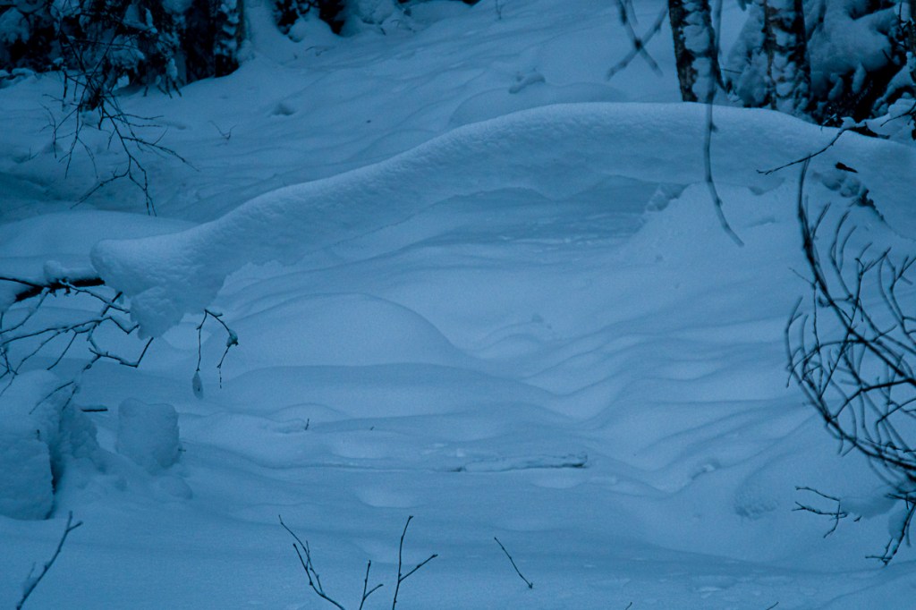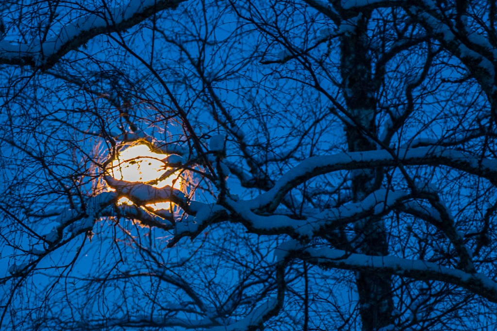 Efter en kall och klar natt då månen hänger i björkens grenar har gråheten försvunnit för ett ögonblick, istället träder blåa snöformer fram. Måtte december ta slut!