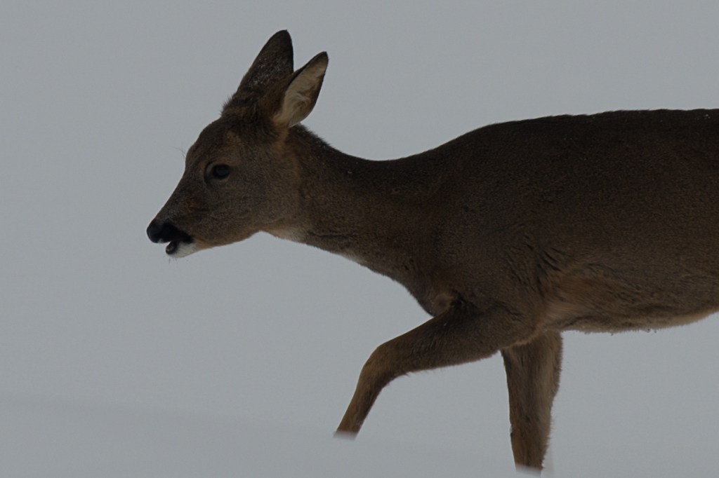 Even in the grey there are signs of activities. The otter has been sliding forward, the marten has been out, the imaginary snow swan is peaking out and the deer is visiting.