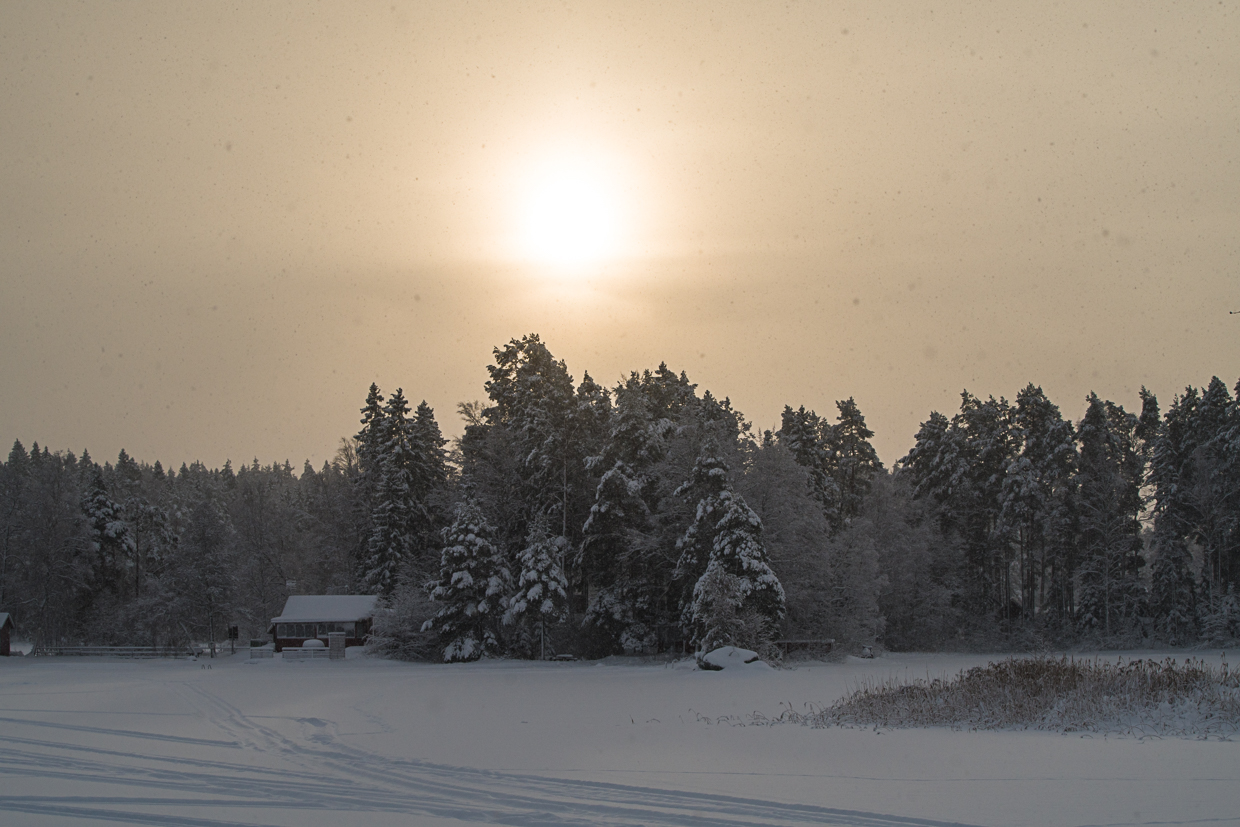 Solens försök att bryta gråheten är ibland fåfäng. Landskapet behåller sin gråhet och granarna vacklar när snömängden blir för stor.