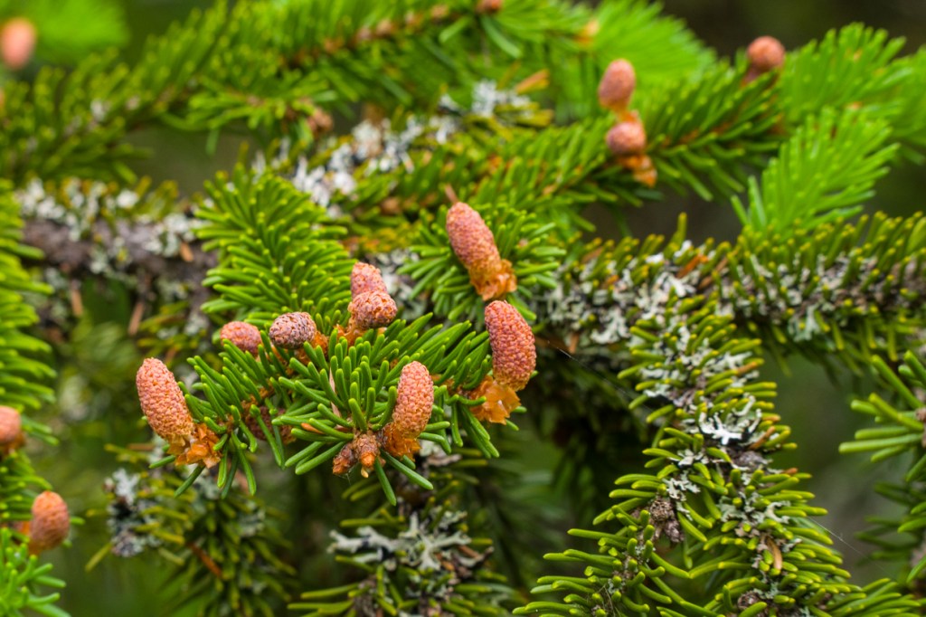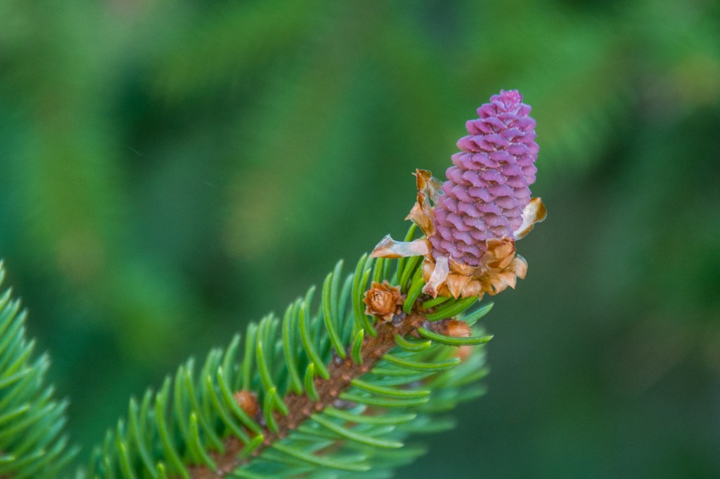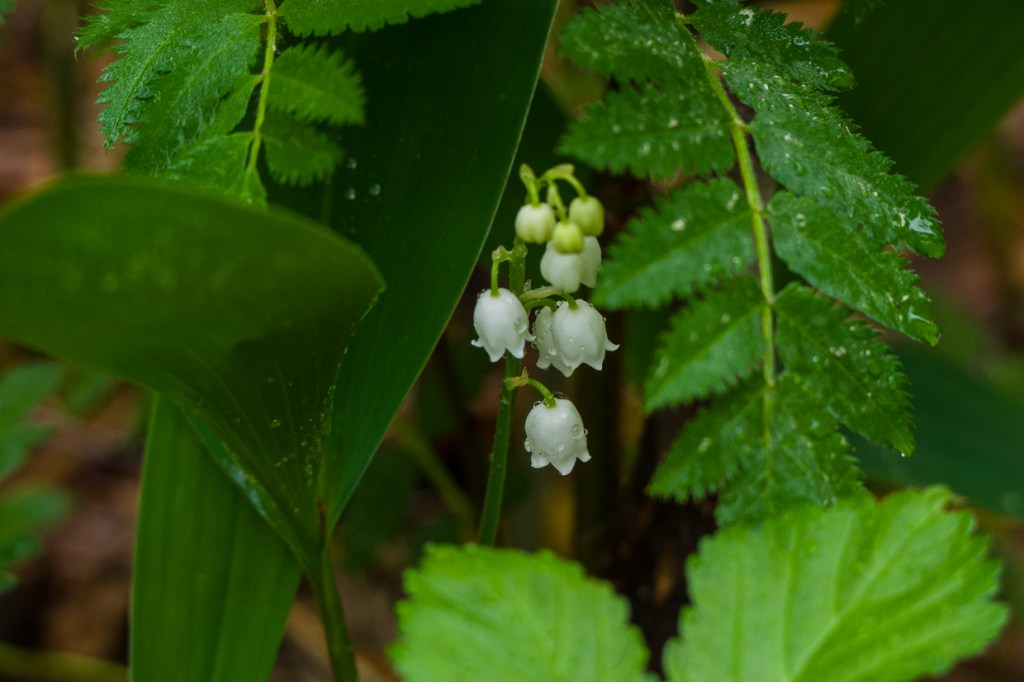 Spruce sprouts swell and show variations. The lily of the valley is budding and blooming. Rowan flowers develop by the pond.