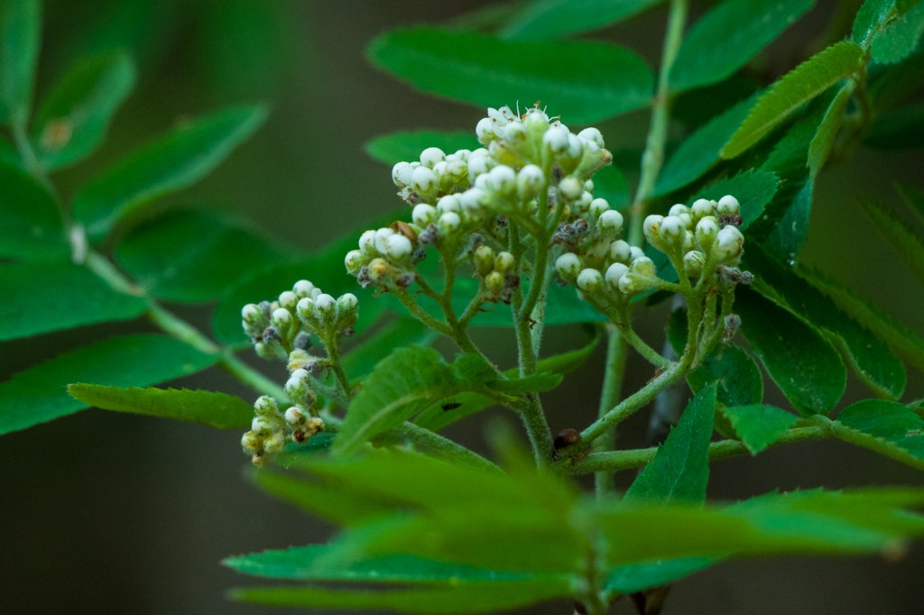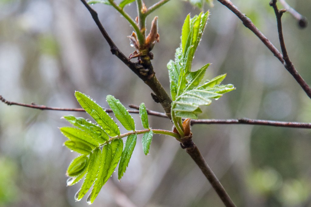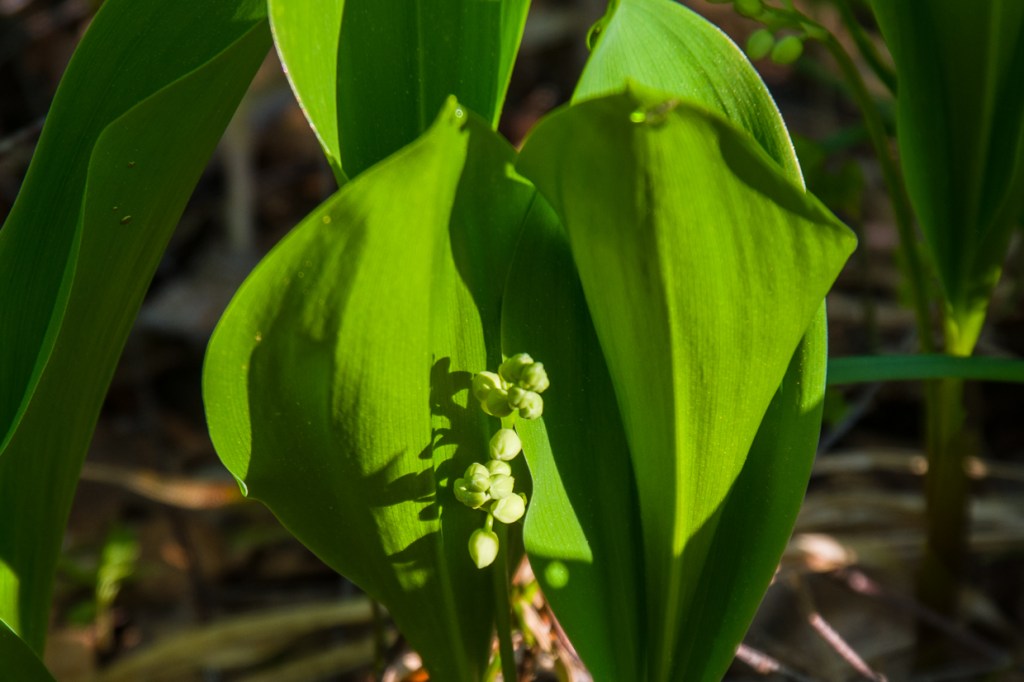 Granknoppar sväller och visar variationer. Liljekonvaljen knoppas och slår ut. Rönnblommor utvecklas vid tjärnen.