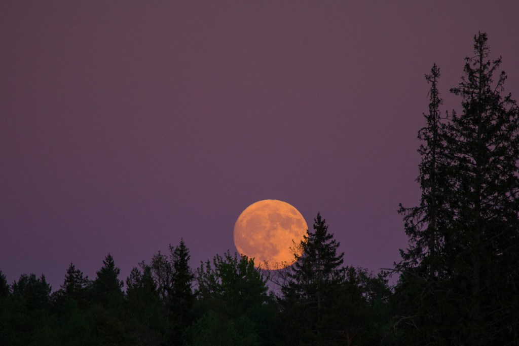 I slutet av maj stiger en grann fullmåne upp över skogskanten och kvällshimlen antar en närmast lila färg. Nu väntar snart en ny månad!