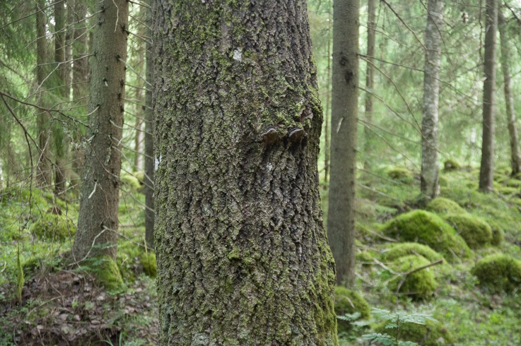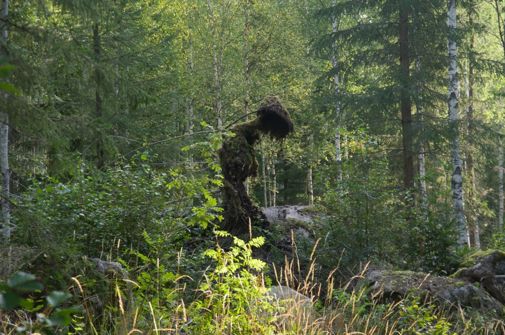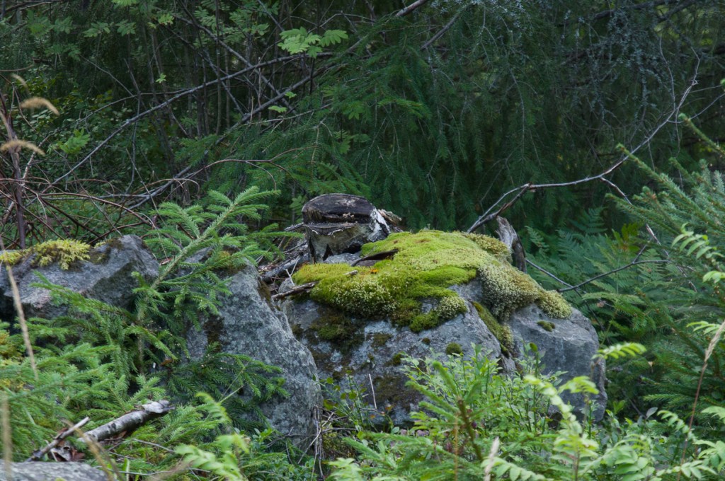 Tjädern har mött sin baneman och gått till sista viloplatsen. Naturen noterar i stenen, håller upp ett svävande granskott och visar deltagande med en efterblomning.