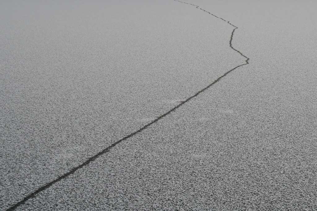 The ice is firm and the changing temperatures leave imprints. Perhaps one of the imaginary ones has found themselves under the ice?