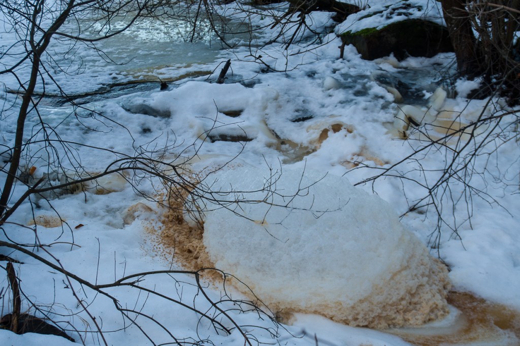 The water playfully moves under the ice edge of the stream, is it a sign of change this wet january?