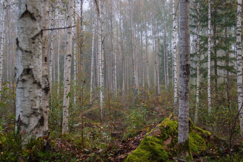I dimman syns plötsligt tillvarons enda storskarv förflytta sej söderöver, medans den fjälliga bläcksvampen reser sej stadig och gråheten speglar sej i tjärnen.